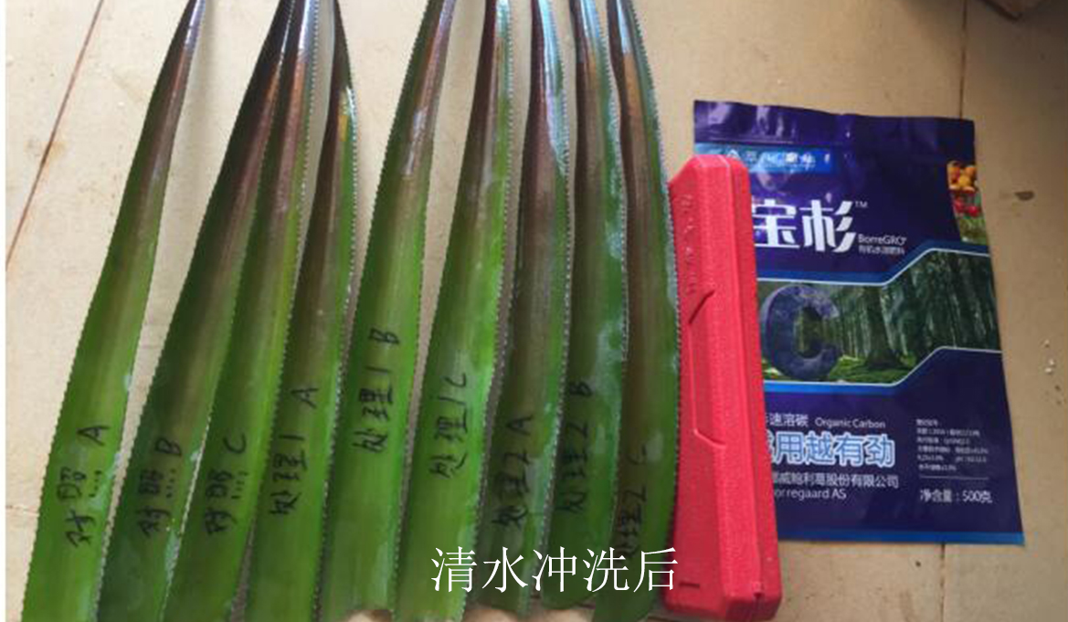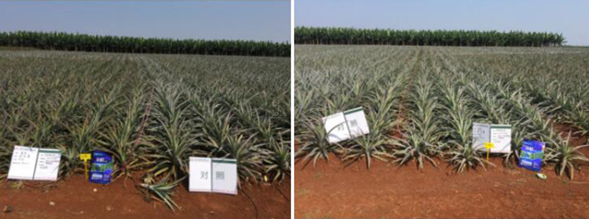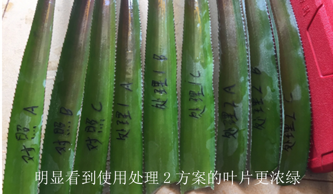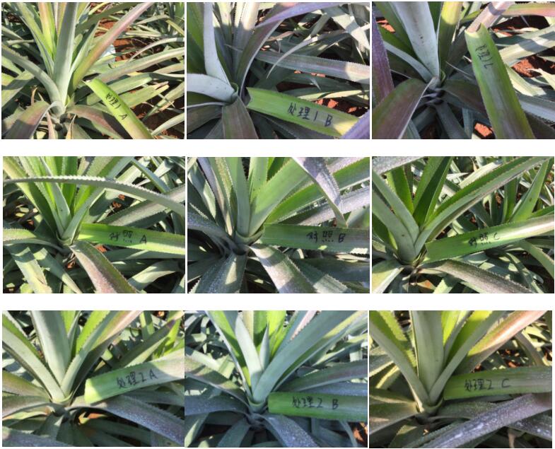 宝杉速溶碳的产品功能能够络合矿物质元素,提高叶面追肥的利用率,此试验在探索宝杉结合复合肥进行叶面喷施对菠萝叶片生长的好处。