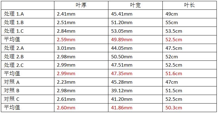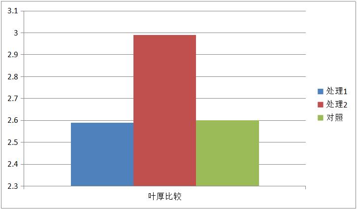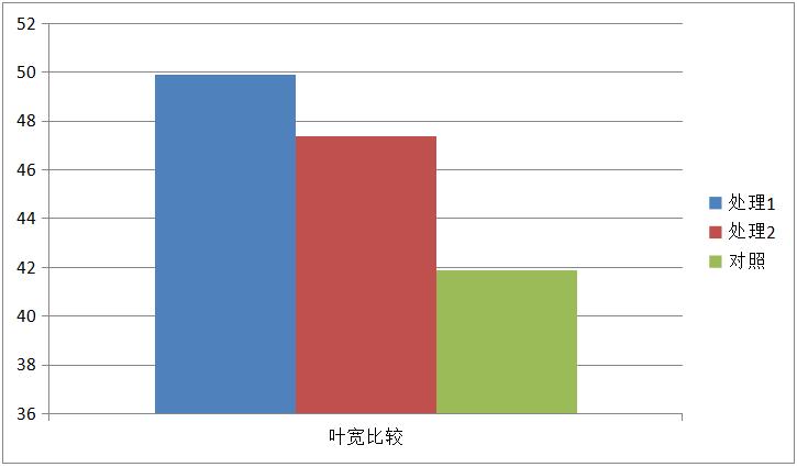 从图表我们可以看出处理2的叶片厚度明显高于处理1和对照组叶宽的平均值比较