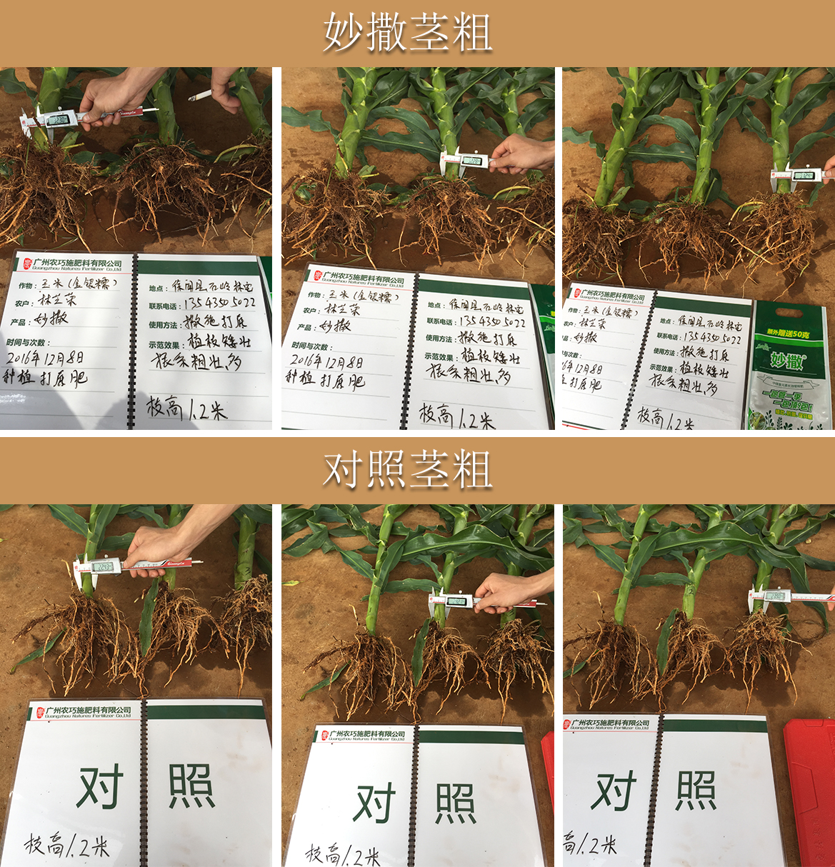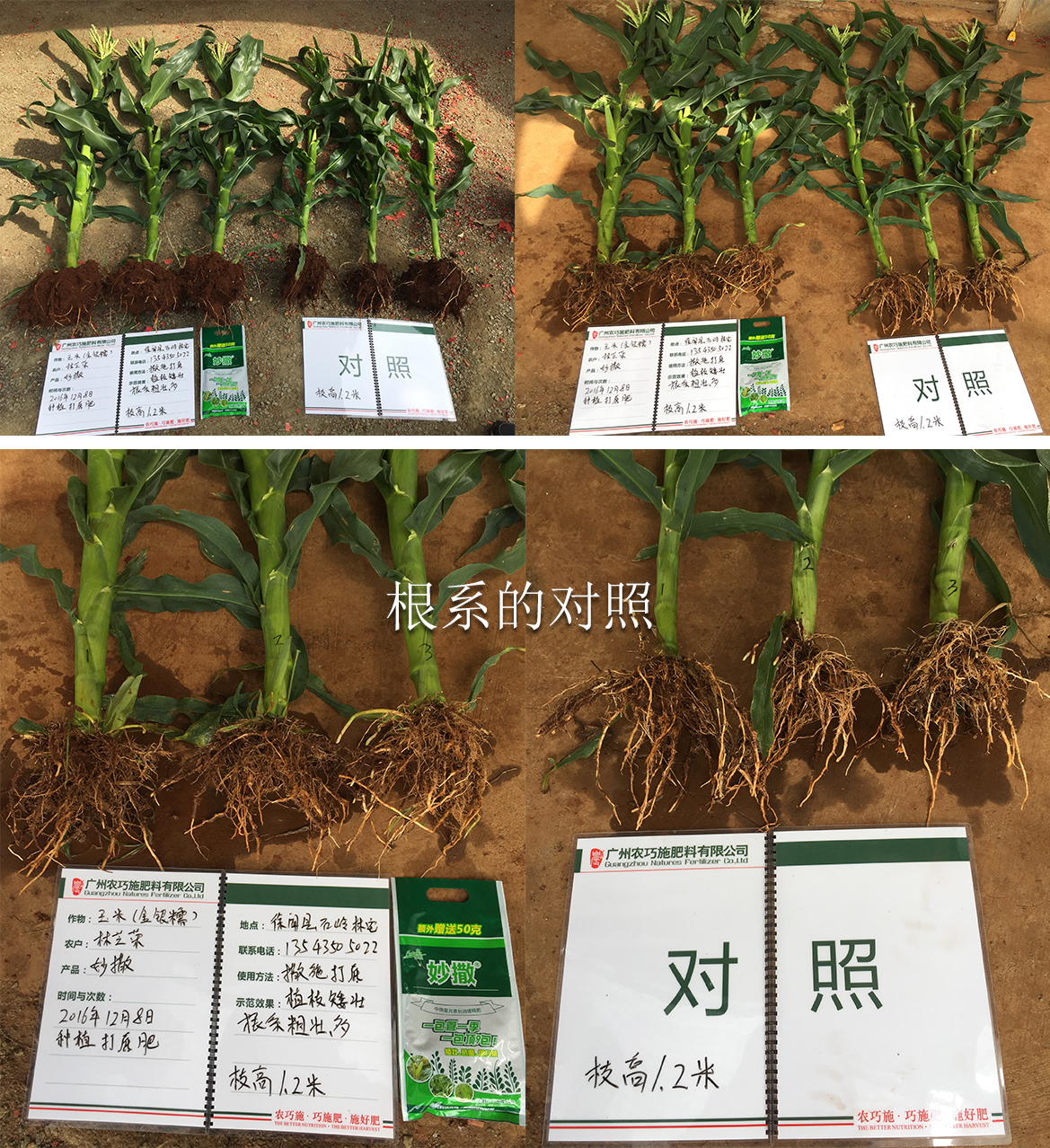 1、整体长势——使用妙撒后的玉米根系旺盛粗壮,带土多,吸肥吸水能力强,叶片大而浓绿。