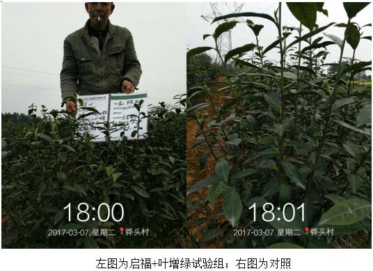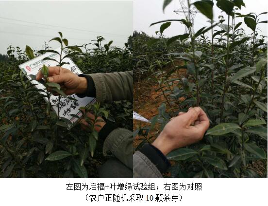 4、结论:低温情况下,茶叶上使用启福+叶增绿叶喷,冲施益土利,使茶叶能更好的抵御低温环境,从而促进茶芽的抽发及生长,达到增产增收的效果。