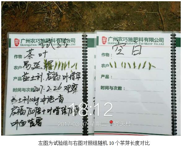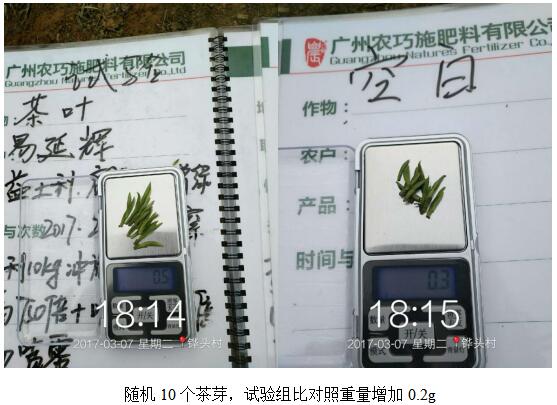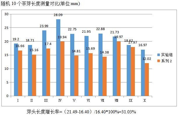 试验数据显示:随机10个芽头长度平均增长率达到31.03%;且随机10个芽头重量,试验组比对照组重0.2g,从而提高茶叶产量。