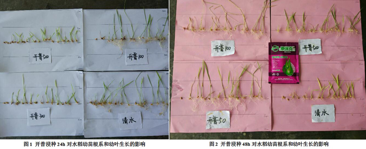 经过开普100倍浸种处理的水稻幼苗根系数量比对照多0.6条以上,主根长度比对照增加0.86cm以上,适当延长浸种时间生根水稻效果更好。