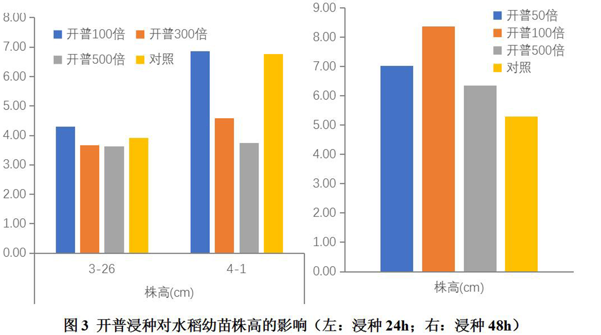 二、 结果与分析:开普100倍浸种处理24h或48h都能够显著增加水稻幼苗株高,开普50倍、500倍浸种处理48h也能够显著增加水稻幼苗株高。