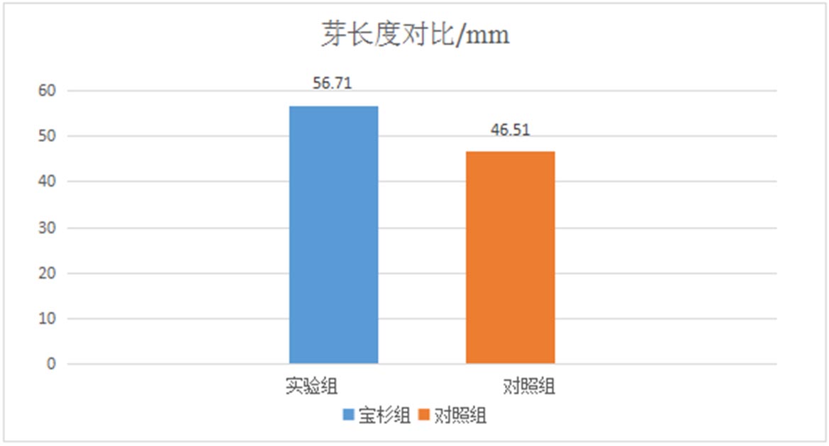 使用宝杉芽的长度56.71mm,清水对照芽的长度46.51mm,试验组比对照组芽长10.2mm,宝衫有效的促进根系对水肥的吸收。
