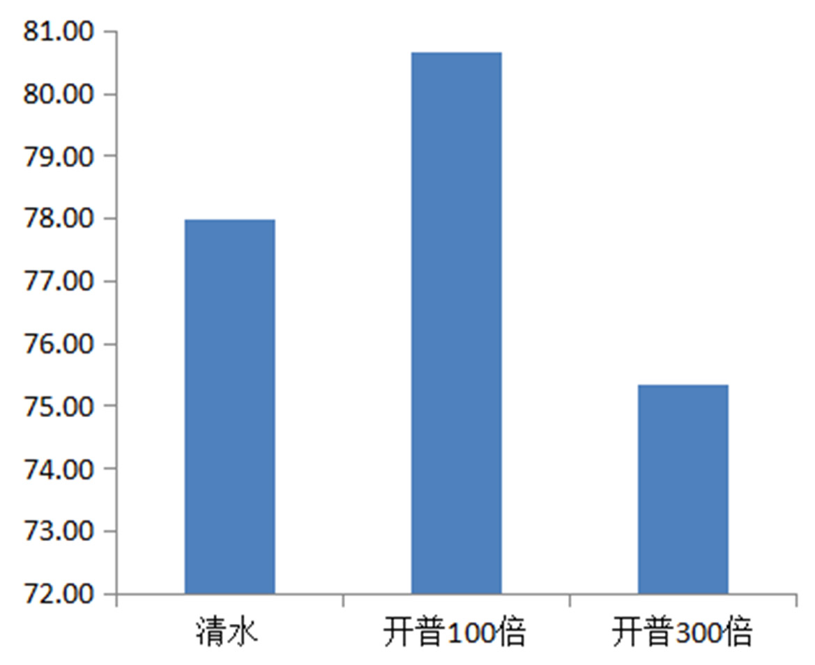 开普KELPAK 100倍液浸种处理能够提高胡萝卜种子发芽率。从图1可以看出,开普KELPAK 100倍液浸种处理能够提高胡萝卜种子发芽率,种子发芽率较清水对照提高3.4%。然而开普KELPAK 300倍液浸种处理降低了胡萝卜种子发芽率,较清水对照降低3.4%。