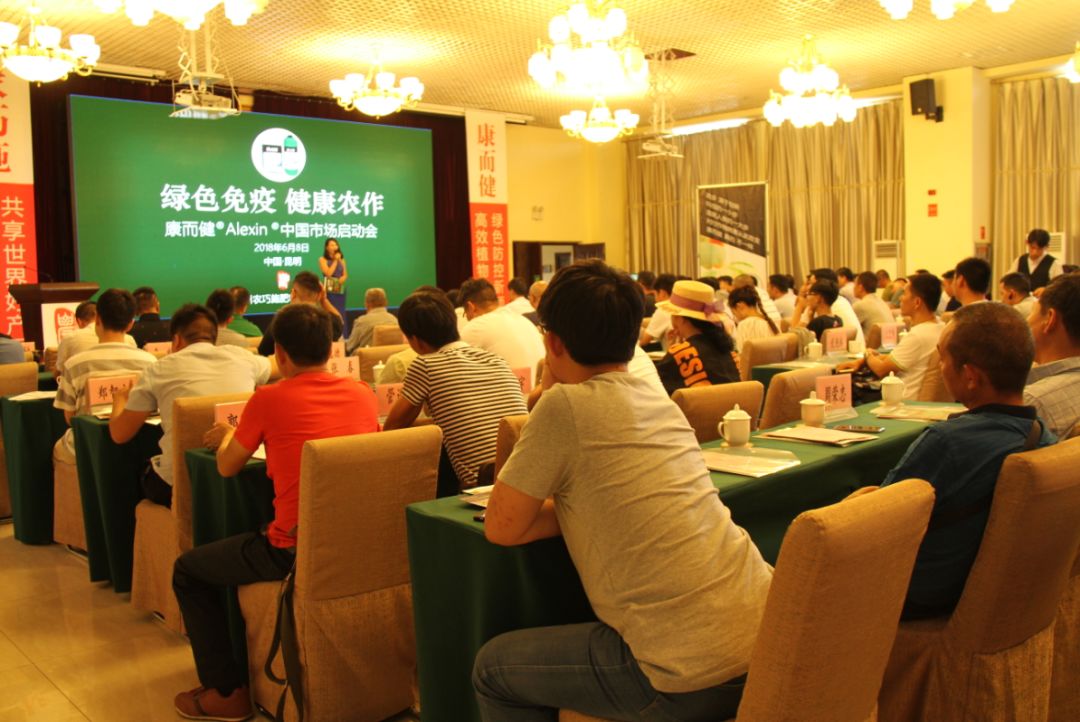 绿色防控离不开植物免疫剂的推广和应用,广州农巧施肥料有限公司作为南非Nulandis公司新型植物免疫剂康而健®Alexin®的中国独家代理,特于2018年6月8日,在昆明举办以“绿色免疫,健康农作”为主题的康而健®Alexin®植物免疫剂中国市场启动会,来自全国各地区的近百家核心农资经销商和零售商受邀参加本次会议,农资与市场杂志社及中国农资传媒等媒体莅临采访报道。