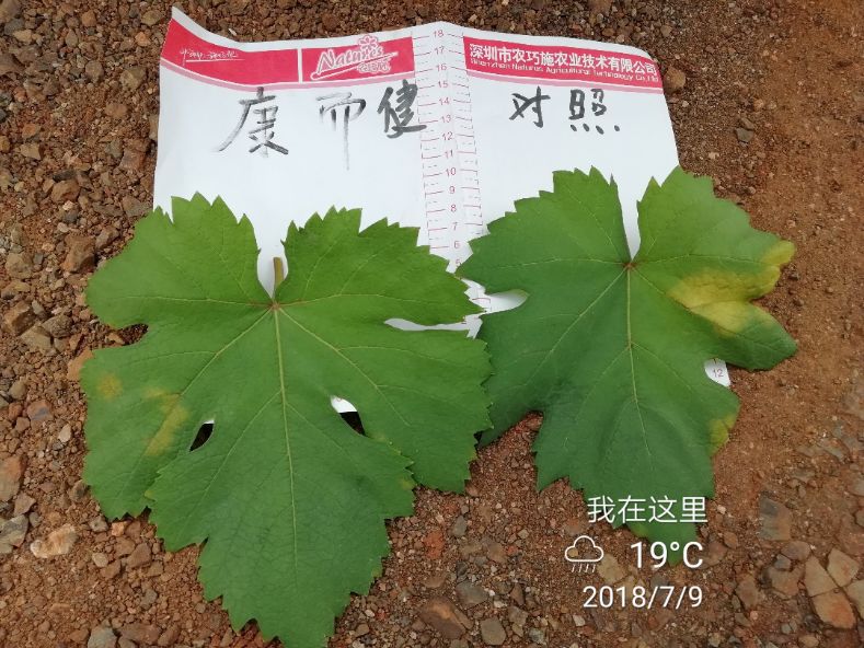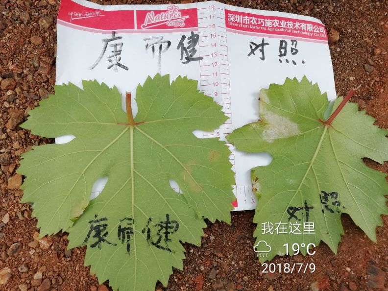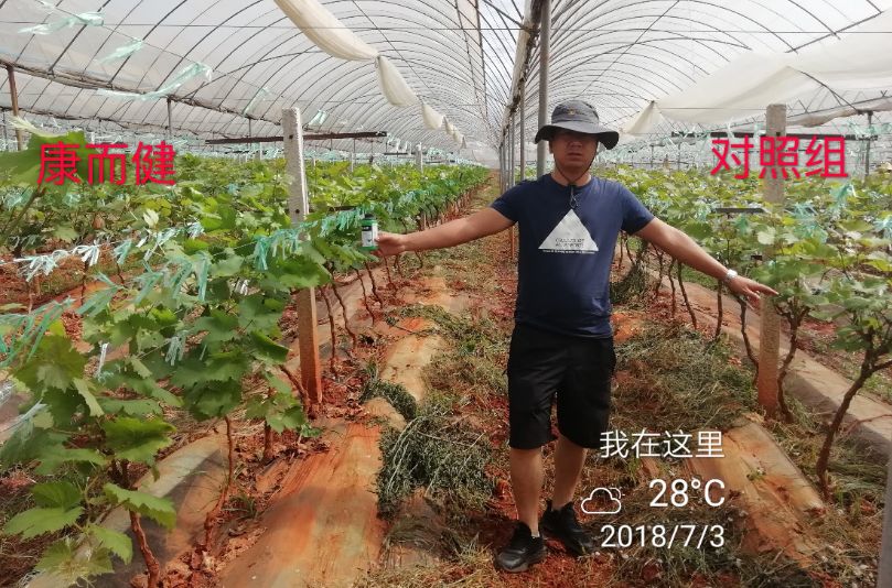 7月3号使用第二次康而健时观察发现,用过康而健的葡萄植株长势要优于没用过的,叶片更为浓绿厚实,抗病性更强。