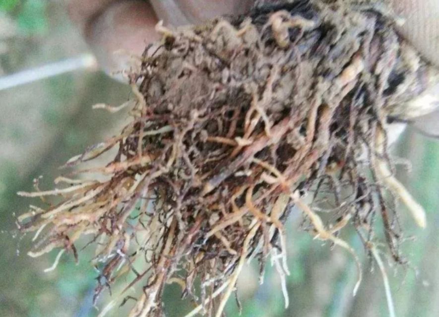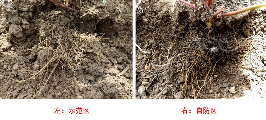 示范区母苗须根多,根系舒展分布广,自防区根系发黑,须根少。