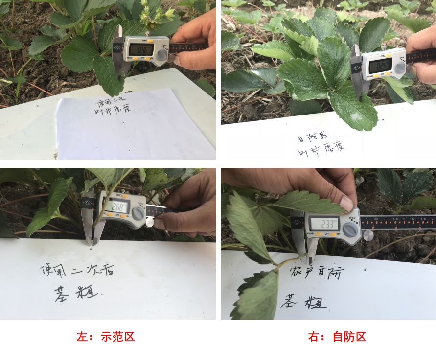 使用两次后叶片厚度与茎粗均优于农户自防。