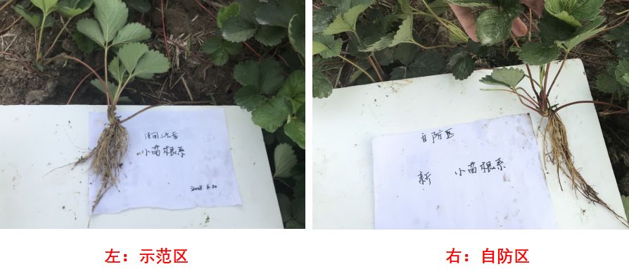 示范区小苗须根多、根系白,对照区小苗根系数量少,根系发黄。