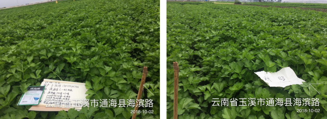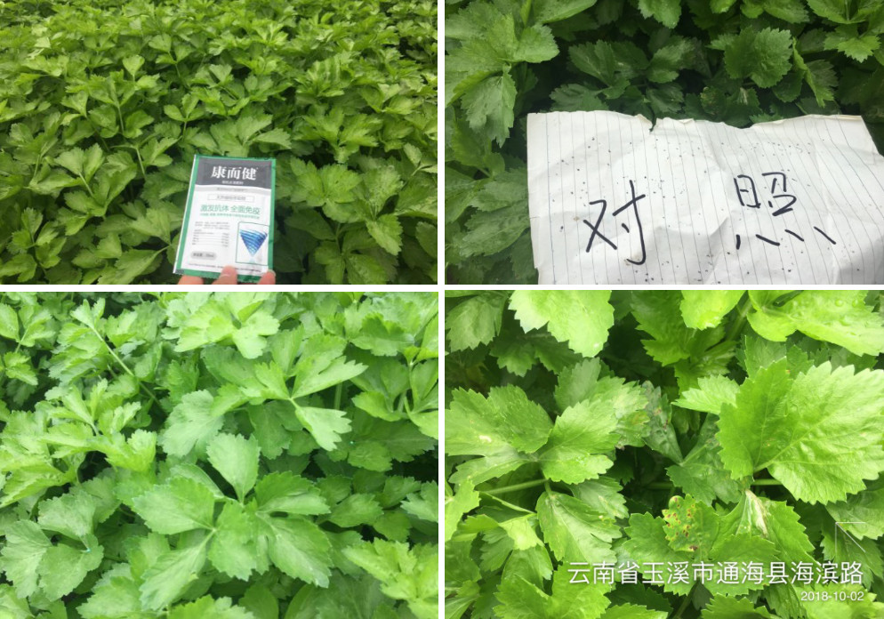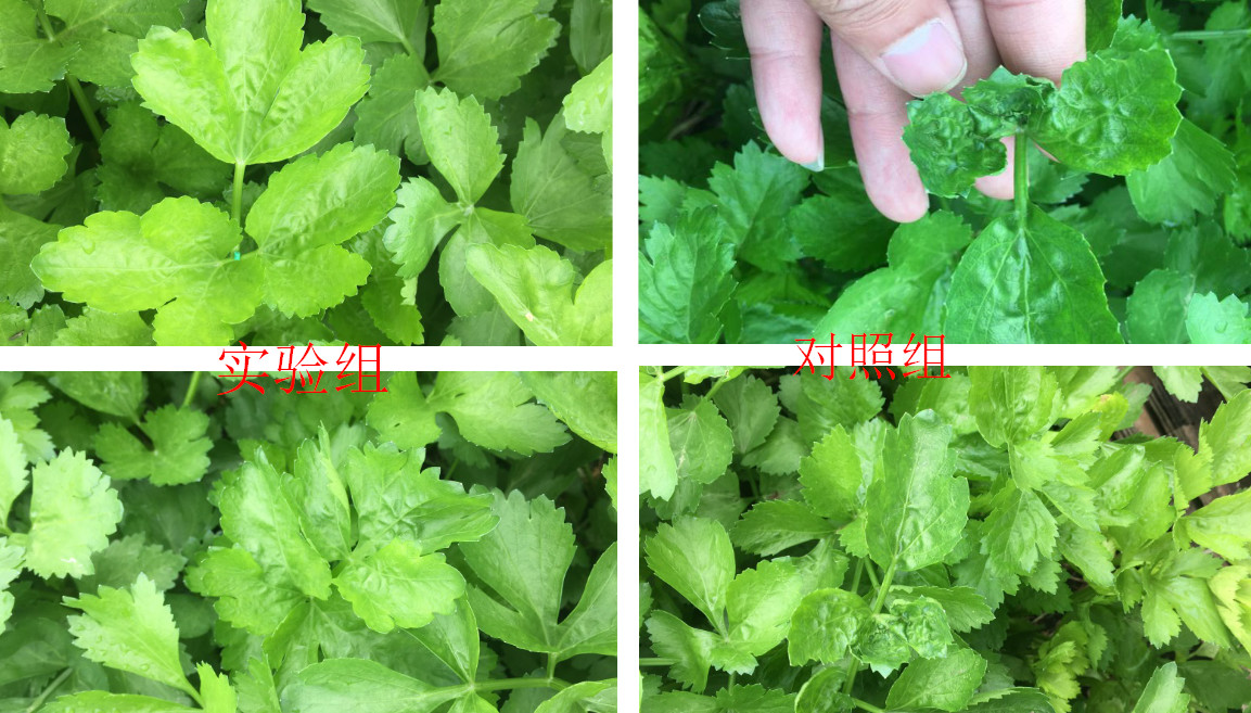 从整体长势到局部再到叶片,试验组比对照组长势好,颜色翠绿、叶片上红点(炭疽)、斑枯、缩叶(病毒)少,叶面清秀病害少,这样的芹菜才能卖上好价钱,这才是农户所需要的高品质芹菜。本次实验说明了康而健在预防真菌、细菌、病毒上均有很好的效果,是农户高品芹菜的好帮手!